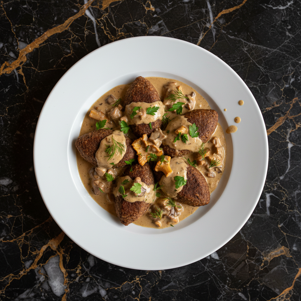 Hearty and flavorful dumplings made with rye flour and ground pork, served with a rich, earthy mushroom gravy. A comforting and traditional Finnish dish.