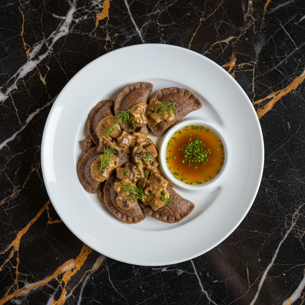 Savory dumplings made with rye flour and filled with a seasoned pork mixture, often served with a mushroom gravy or a simple broth.