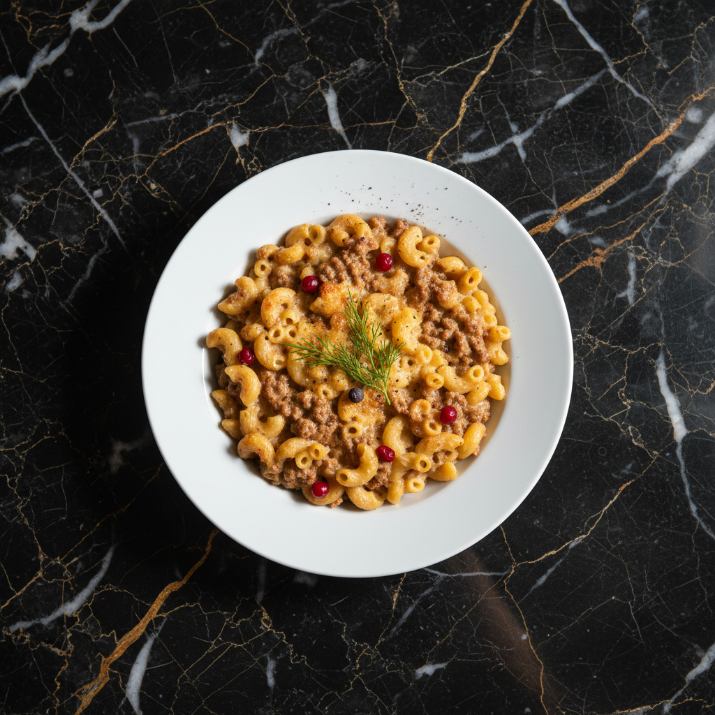 A hearty and comforting Finnish macaroni casserole, a popular dish often made with ground reindeer meat for a rich, gamey flavor, baked with macaroni and a creamy sauce.