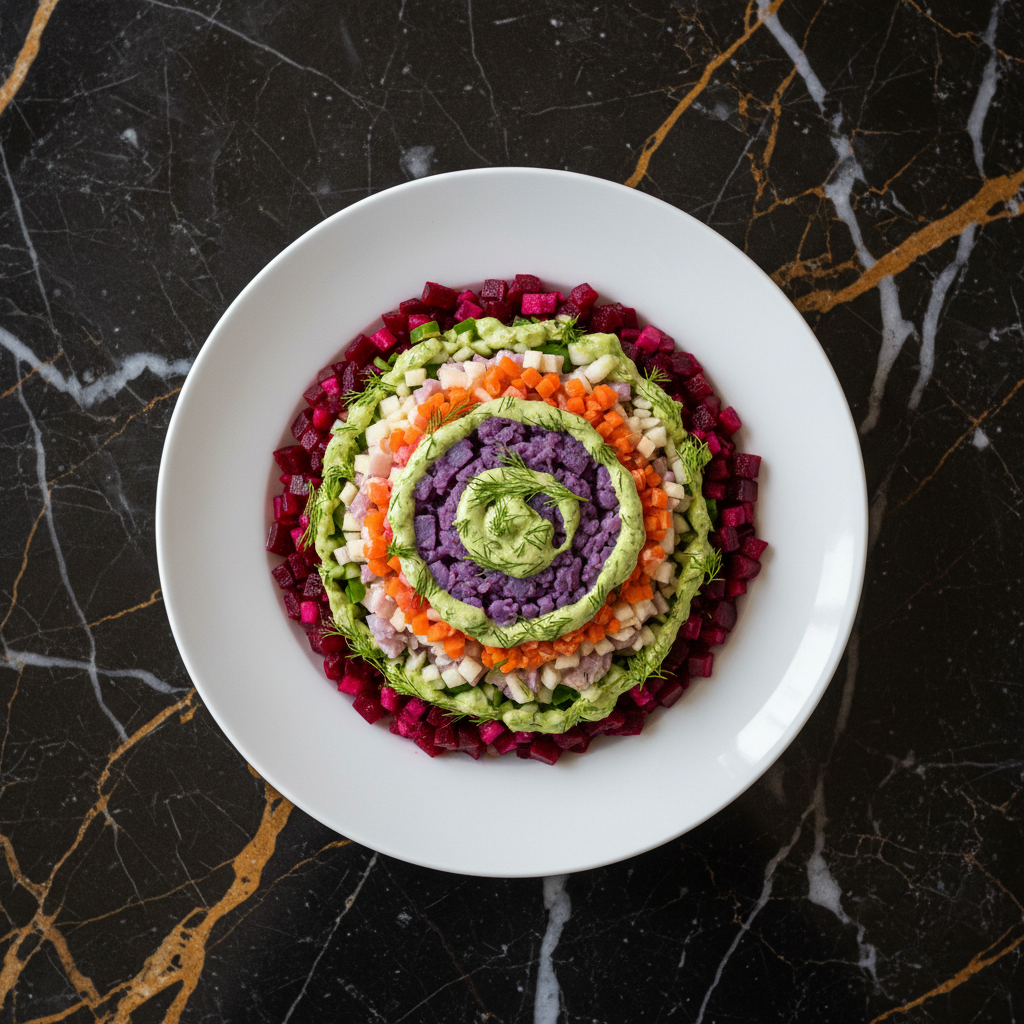 A vibrant and colorful layered salad, Rosolli is a traditional Finnish dish often served during holidays. This version includes pickled herring for a briny, savory element, layered with cooked root vegetables and a creamy dill dressing.