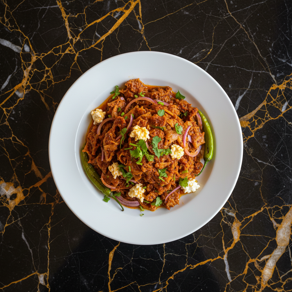 A flavorful and comforting Ethiopian breakfast dish made from shredded injera simmered in a rich berbere sauce, often enhanced with caramelized onions and optional eggs.
