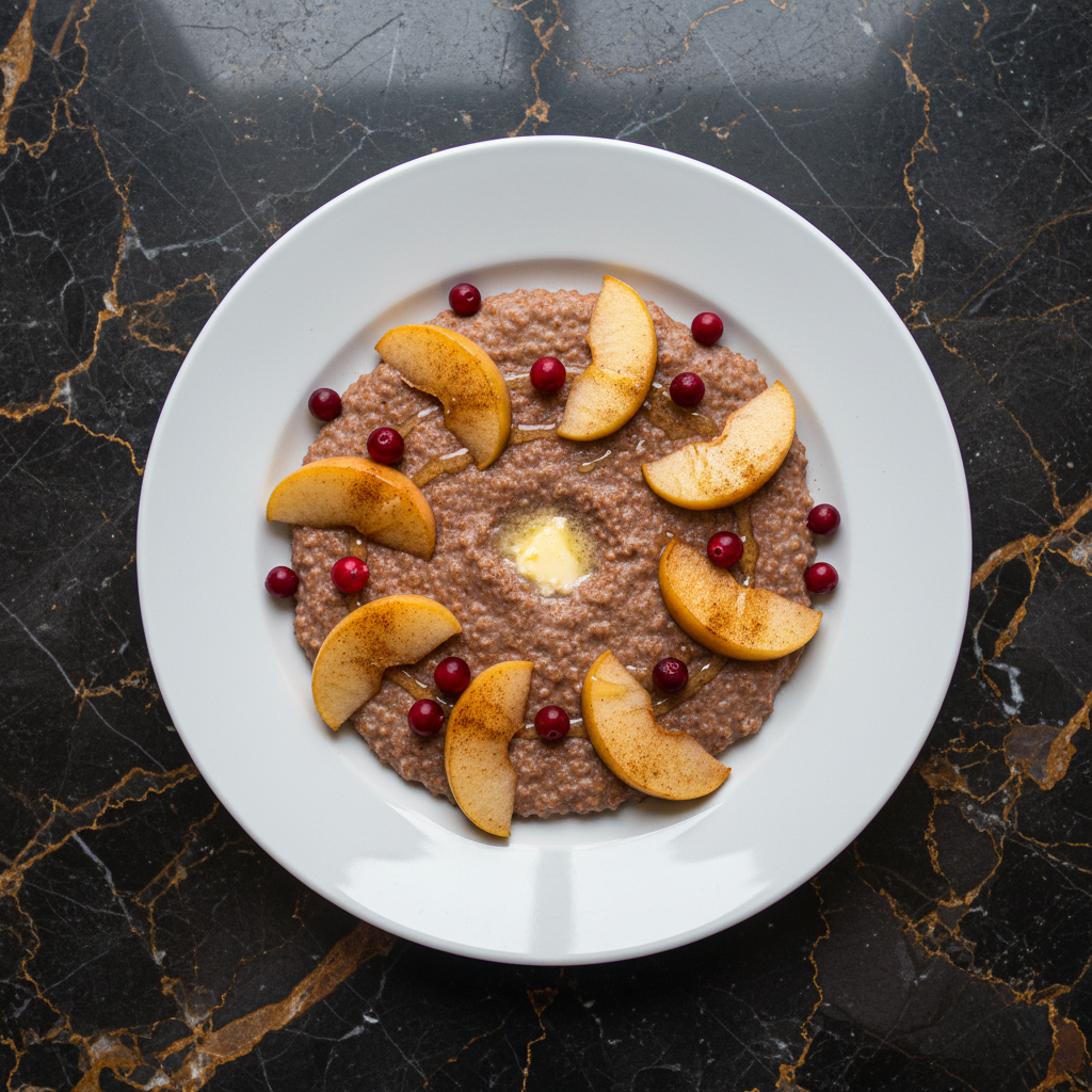A hearty and wholesome breakfast porridge made from rye flour, cooked until thick and creamy, and served with tender, slightly spiced apple wedges. A comforting and nutritious start to the day.