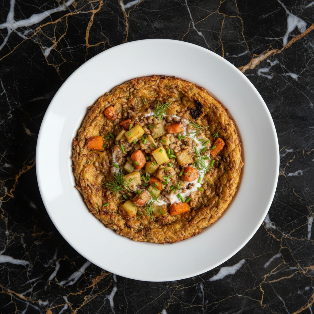 A hearty and rustic casserole featuring a base of cooked rye grains mixed with a medley of seasonal root vegetables like carrots, parsnips, and potatoes. Baked until tender and slightly crisp on top, this dish is a flavorful and filling vegetarian option, often seasoned with herbs and a touch of cream.