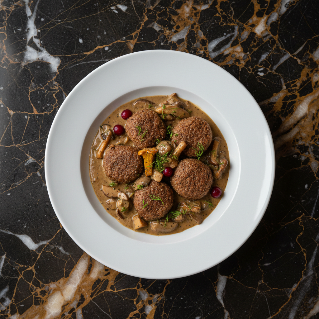 Hearty dumplings made with rye flour and filled with savory ground reindeer, served in a rich, earthy mushroom gravy. A true taste of Lapland.