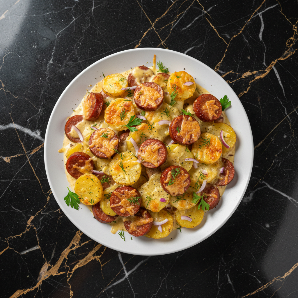 A hearty and comforting Finnish casserole featuring sliced potatoes and flavorful sausage baked in a creamy sauce, often with onions and cheese.