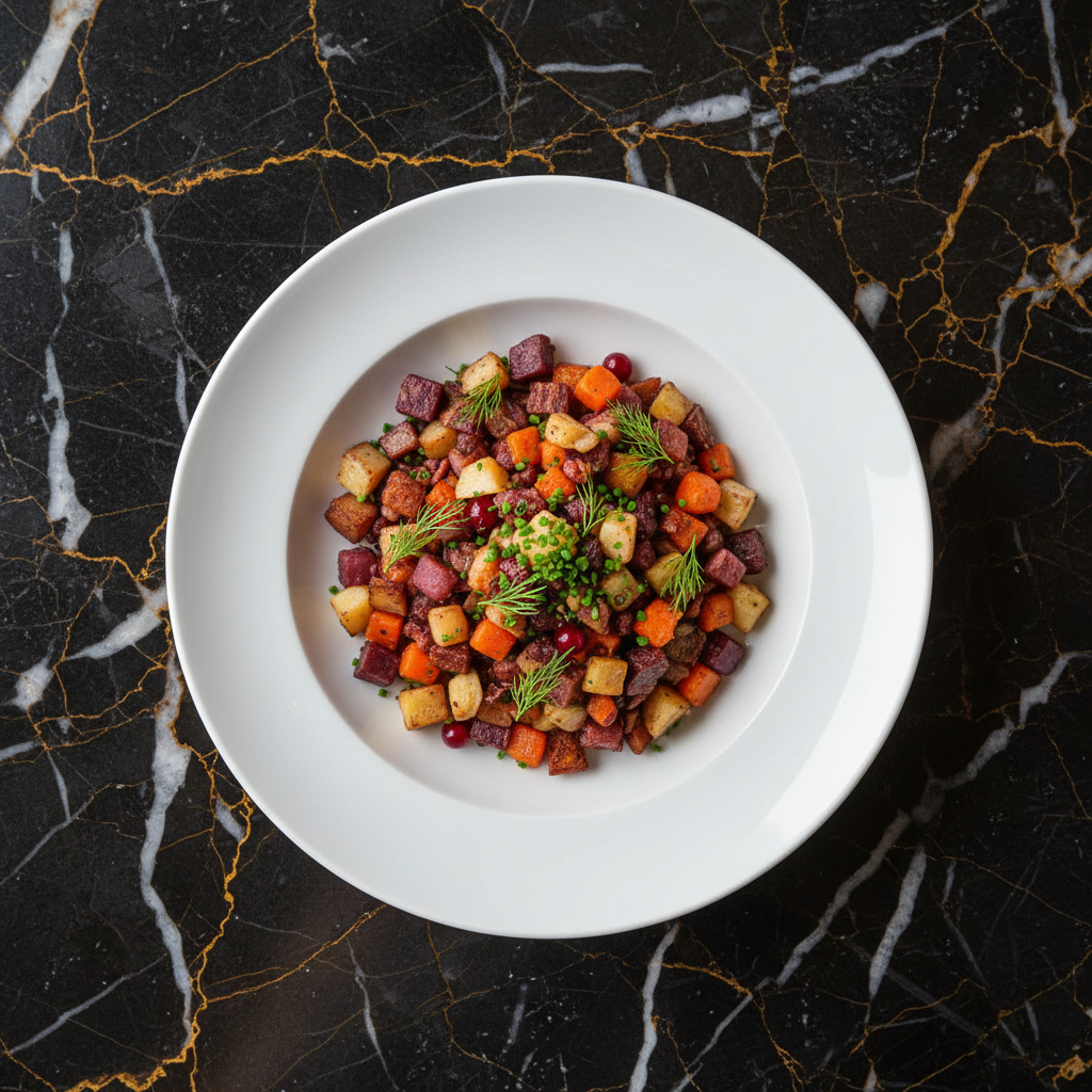 A hearty and rustic hash featuring savory smoked reindeer meat combined with a medley of tender root vegetables, seasoned to perfection. A classic dish often enjoyed in colder months.