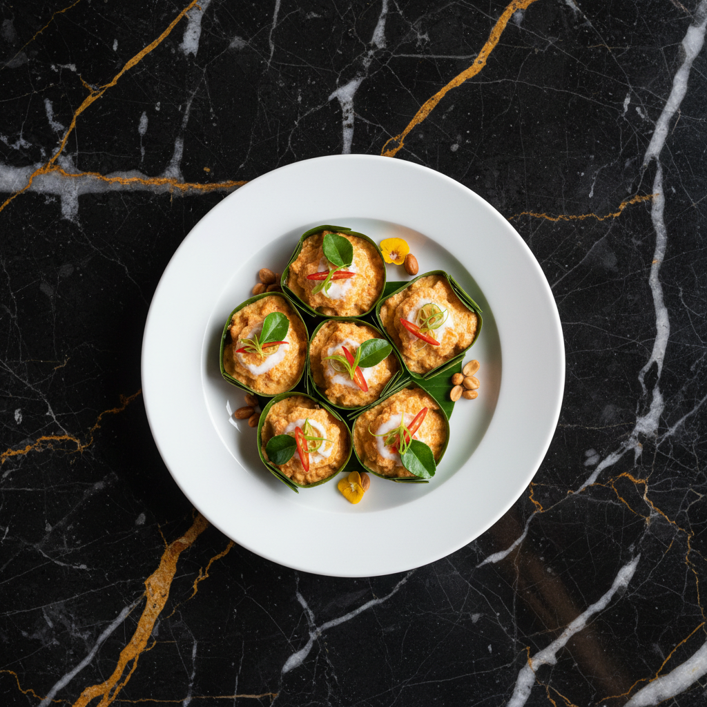 Amok Trey is a celebrated Cambodian dish, often considered the national dish, featuring tender pieces of fish gently steamed in a fragrant coconut milk curry sauce infused with kroeung (a traditional Khmer spice paste). The mixture is typically steamed in banana leaf cups, giving it a delicate, mousse-like texture. It's a harmonious blend of savory, slightly sweet, and aromatic flavors.