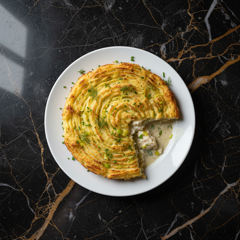 A comforting and flavorful fish pie featuring a creamy white sauce with mixed fish, topped with a rustic mash of potatoes and leeks, offering a delightful twist on traditional pies.