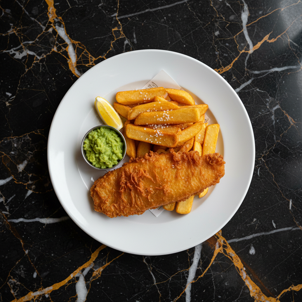 A classic British takeaway dish featuring flaky, battered fish and thick-cut, crispy chips, traditionally served with mushy peas and malt vinegar.