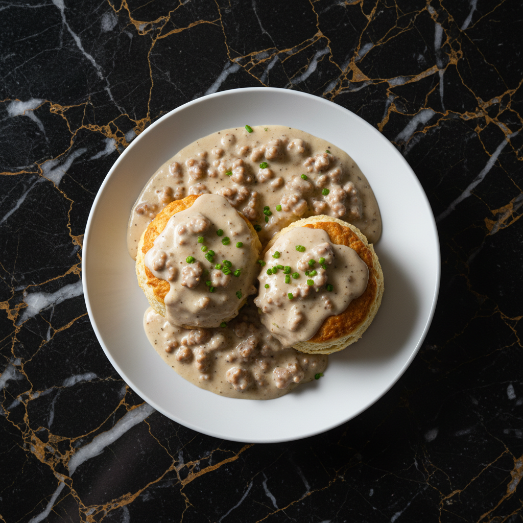 A classic Southern breakfast featuring tender, flaky biscuits smothered in a rich, peppery sausage gravy. Perfect for a hearty start to the day.