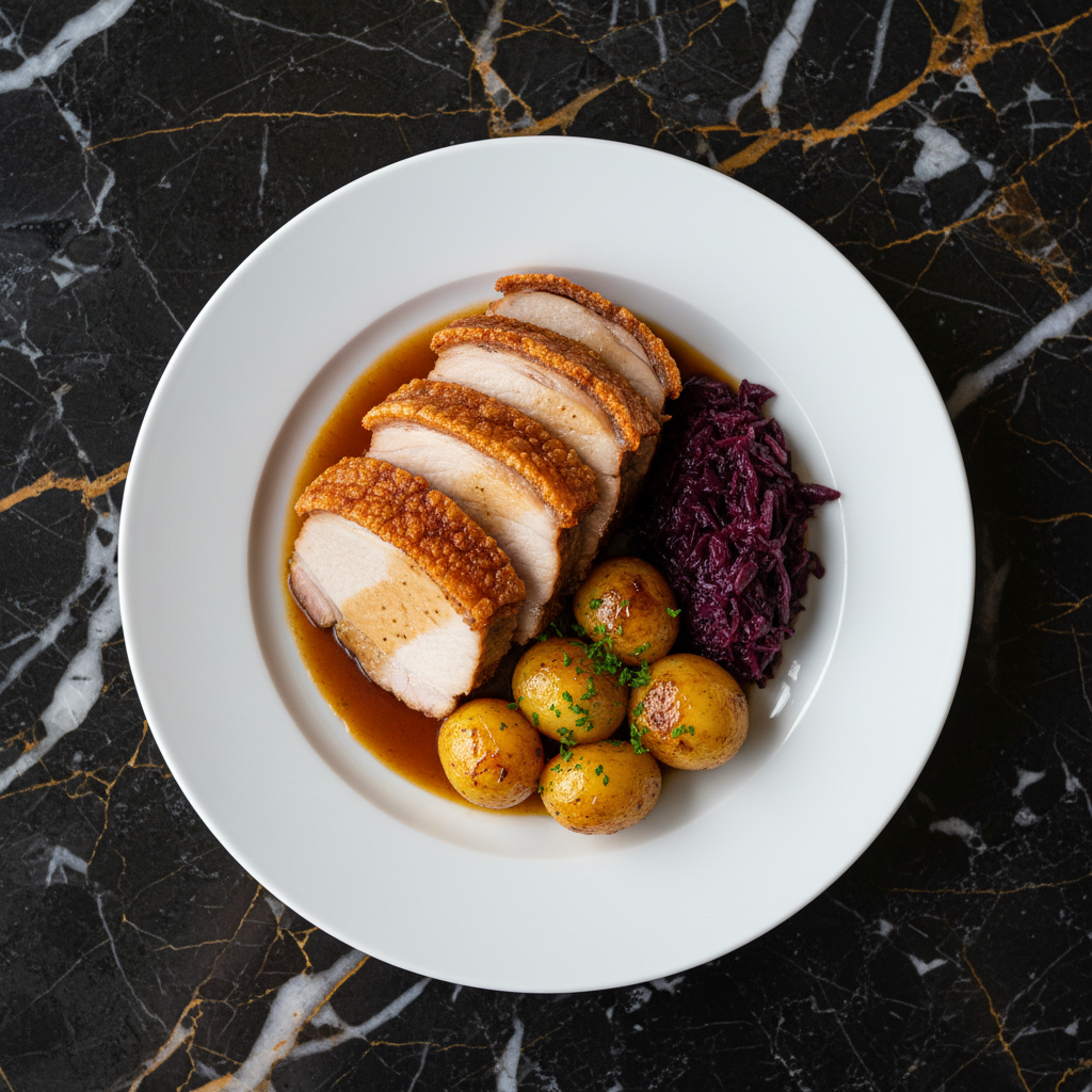 A quintessential Danish dish, Flรฆskesteg features a succulent pork loin roast with incredibly crispy crackling, often served with caramelized potatoes and red cabbage.