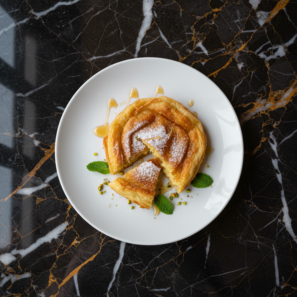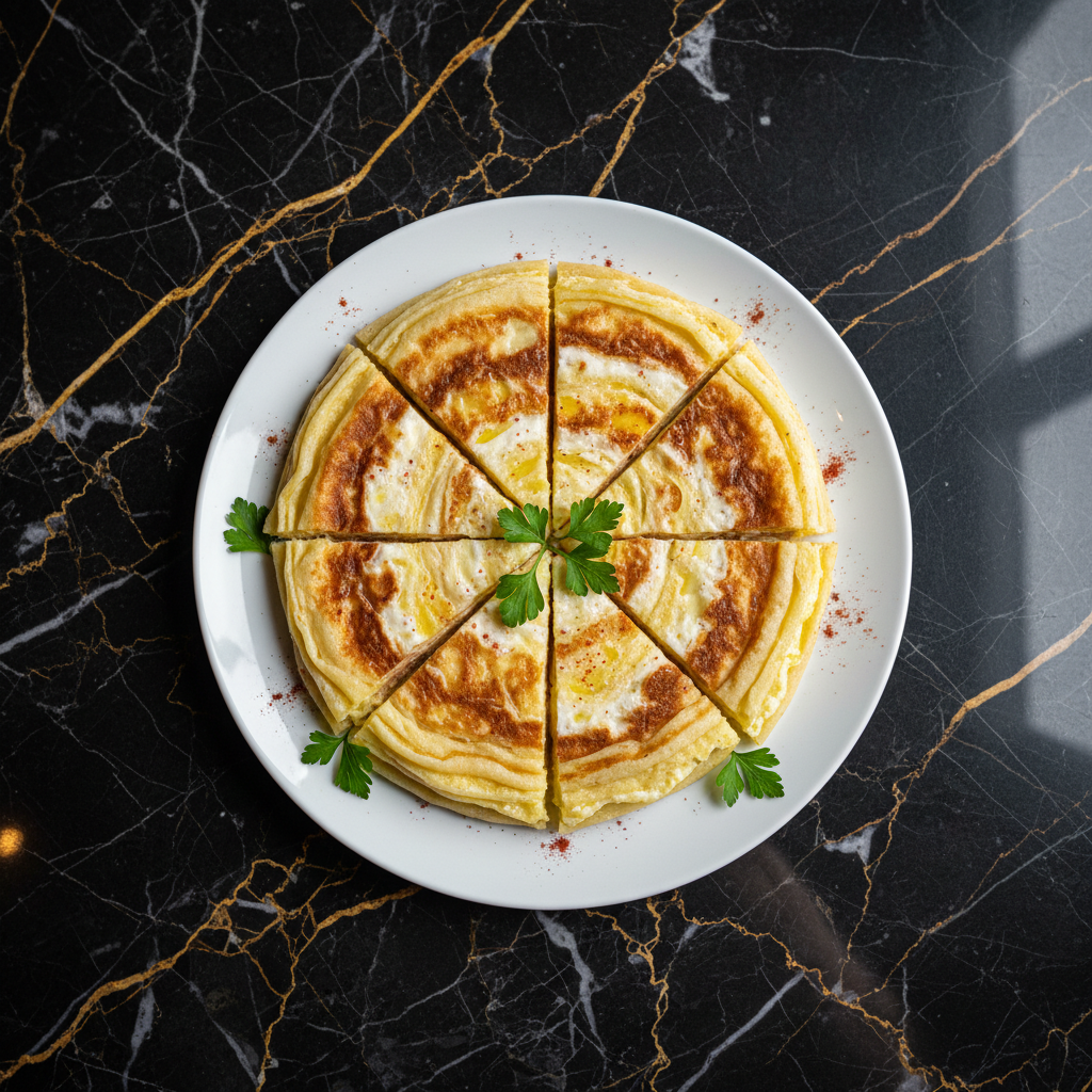 Fiteer Meshaltet is a traditional Egyptian layered pastry, often described as an Egyptian pizza or a flaky pie. It's made by laminating dough with generous amounts of butter or ghee, creating numerous delicate, crispy layers. It can be enjoyed as a sweet treat or a savory main course.
