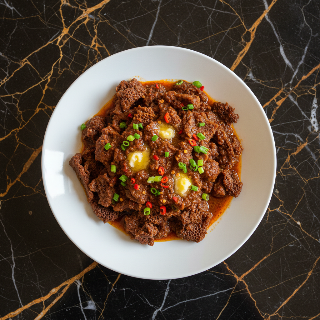 A popular Ethiopian breakfast dish or a way to repurpose leftover injera. Torn pieces of injera are tossed with a fragrant spiced butter sauce, often enriched with sautรฉed onions and berbere spice blend.