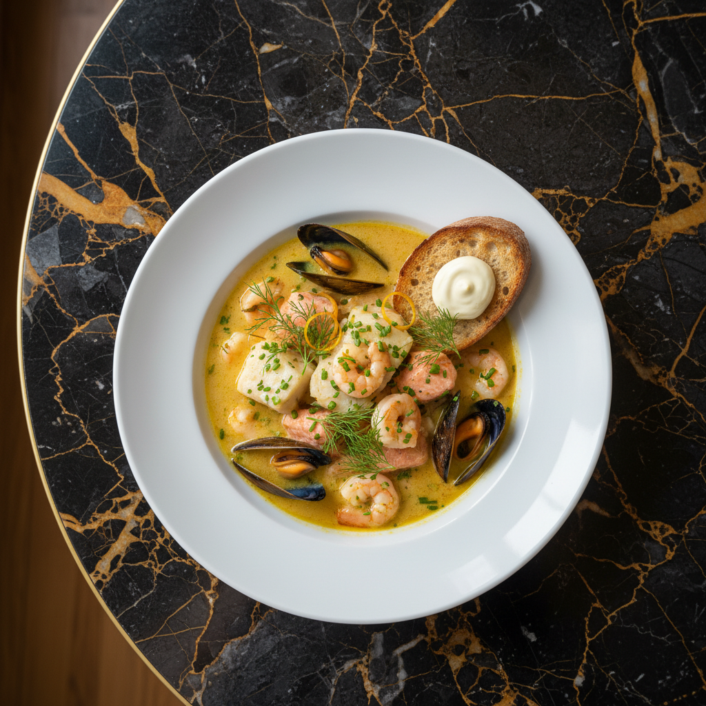 A luxurious and creamy fish stew, featuring a medley of seafood in a delicate saffron-infused broth. This dish is elegant enough for special occasions but simple enough for a comforting weeknight meal.