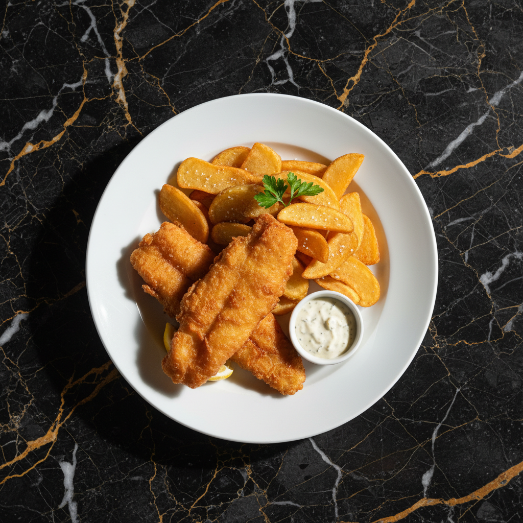 Classic Australian fish and chips featuring tender, flaky flathead fillets coated in a crispy beer batter, served alongside thick-cut, golden fries. A quintessential beach town treat.