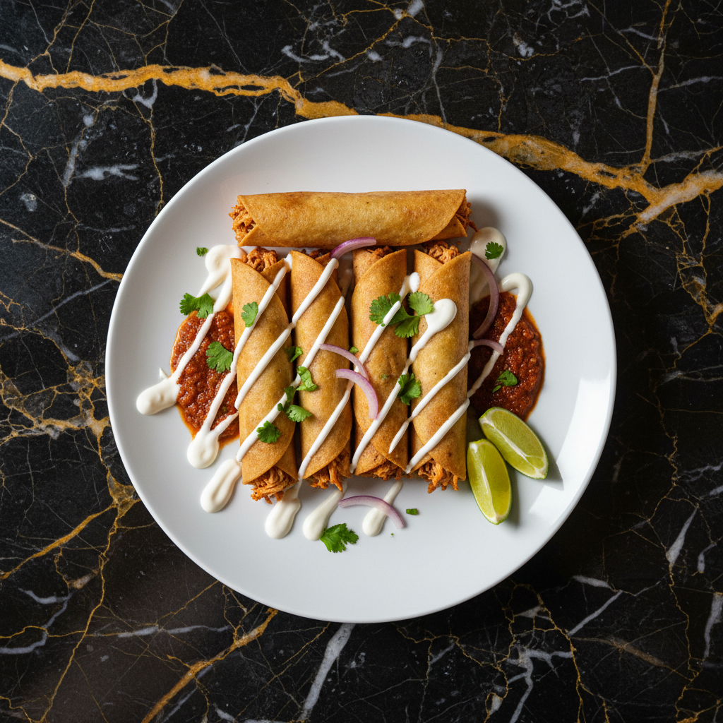Authentic Mexican flautas, also known as taquitos, are made by tightly rolling corn tortillas around a savory filling, then deep-frying them until perfectly golden and crispy. Traditionally filled with shredded chicken or beef, these are a delightful appetizer or main course, best served with cool crema, vibrant salsa, crisp lettuce, and crumbled queso fresco.