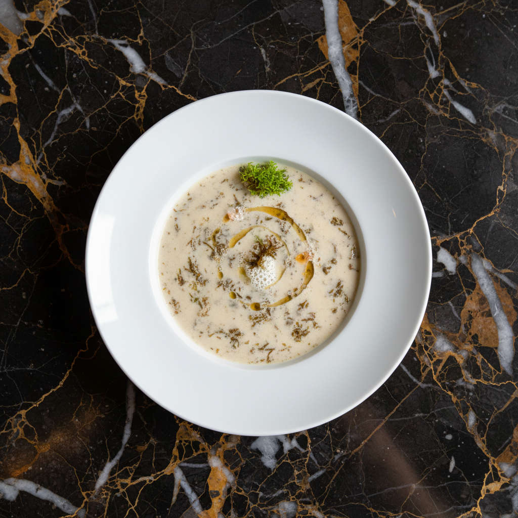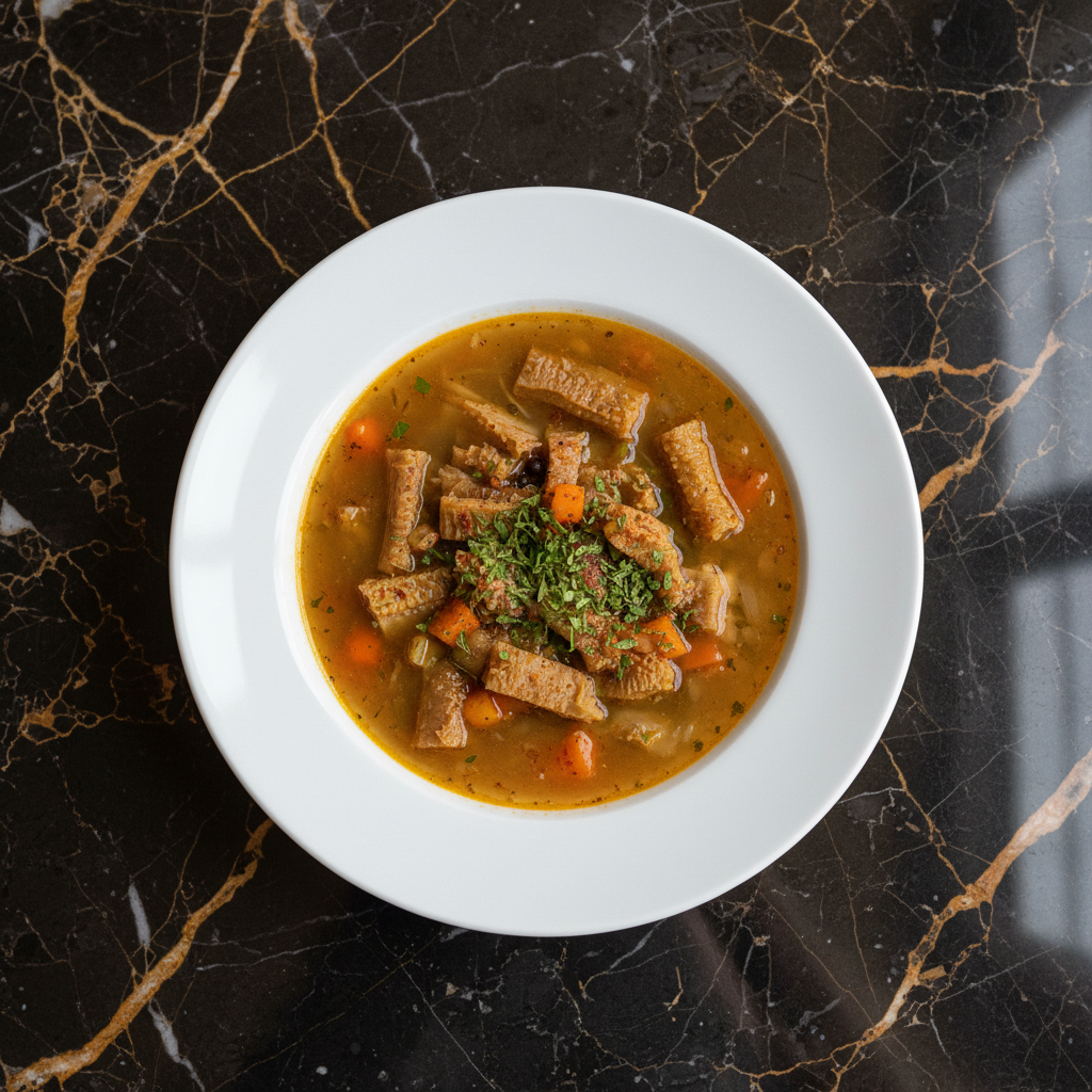 A hearty and traditional Polish tripe soup, featuring tender beef tripe simmered in a rich, savory broth infused with paprika and vegetables. This soup is known for its distinctive flavor and comforting warmth.