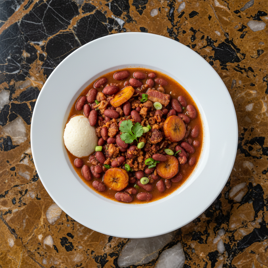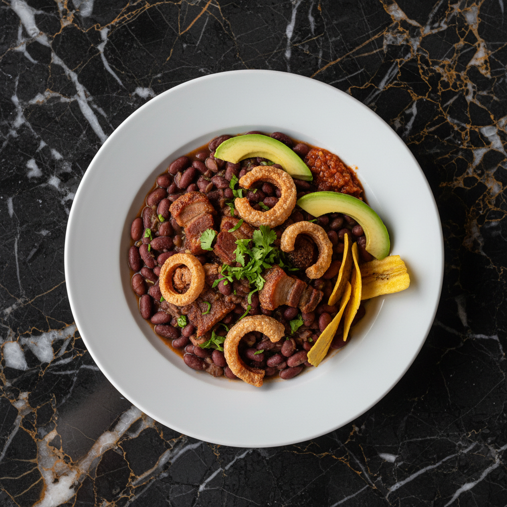 A hearty and comforting Colombian classic, this dish features tender red beans slow-cooked with aromatic hogao, thickened with green plantain, and crowned with crispy chicharrรณn (pork rinds). Perfect for a satisfying meal.