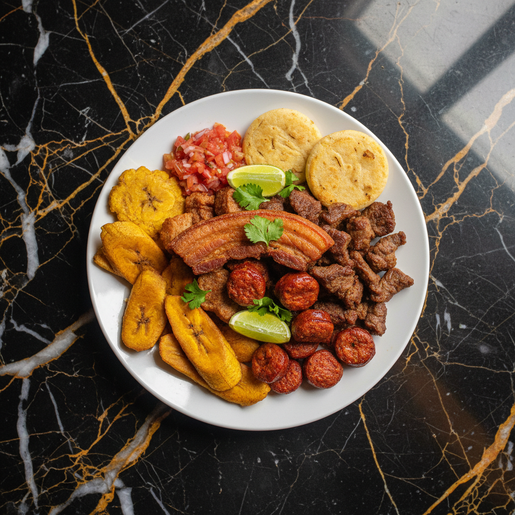 A vibrant and hearty Colombian mixed grill, Fritanga is a celebratory platter featuring an assortment of perfectly fried and grilled meats, starchy sides, and traditional accompaniments. It's a quintessential street food and a popular choice for gatherings.