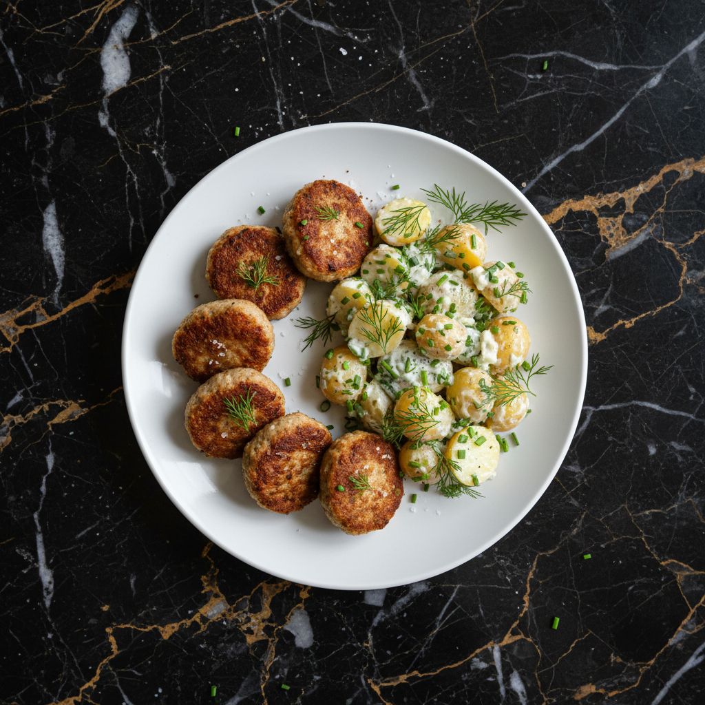 Juicy Danish meatballs (frikadeller) served with a creamy, tangy potato salad. A beloved classic for everyday meals and gatherings.