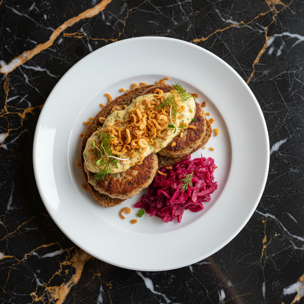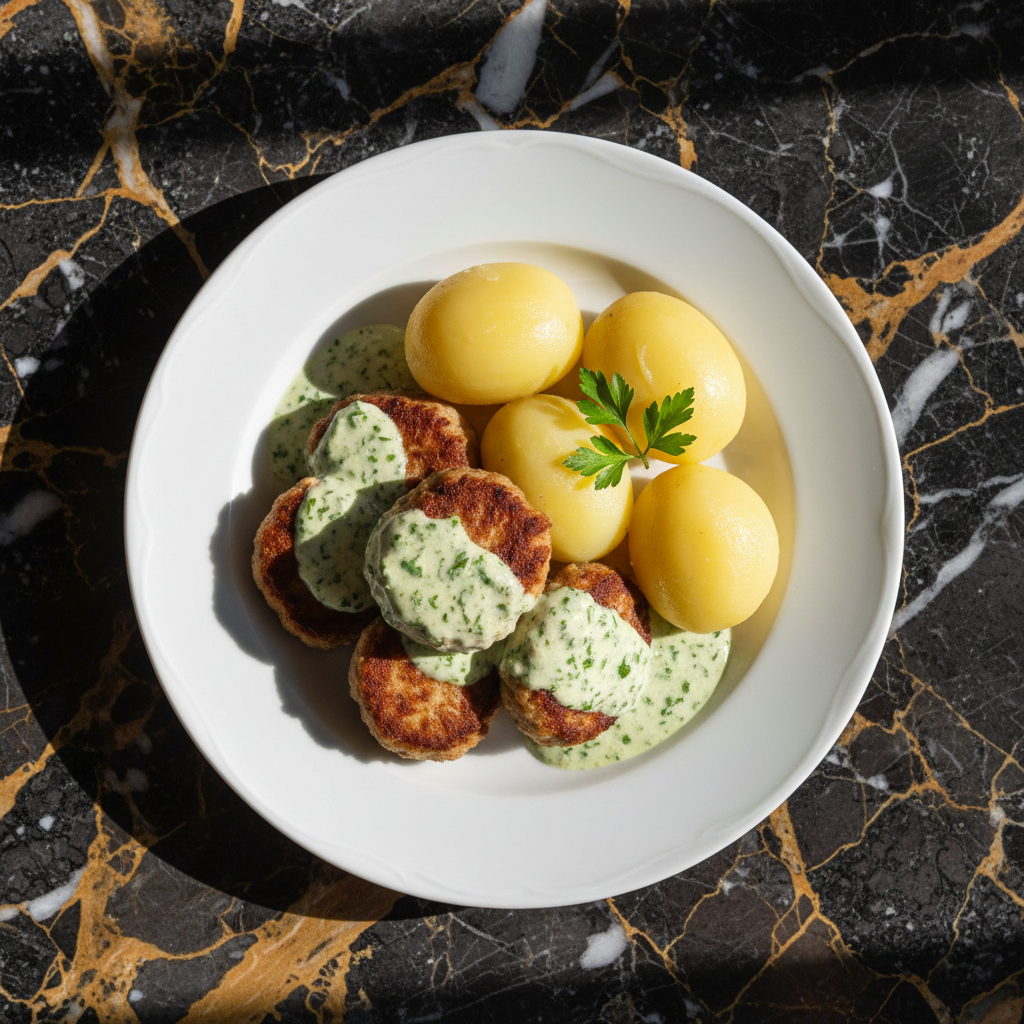 A quintessential Danish comfort food, Frikadeller are pan-fried meatballs, typically made from a mixture of pork and veal, served with a creamy parsley sauce and boiled potatoes. This dish embodies simple, hearty Danish home cooking.
