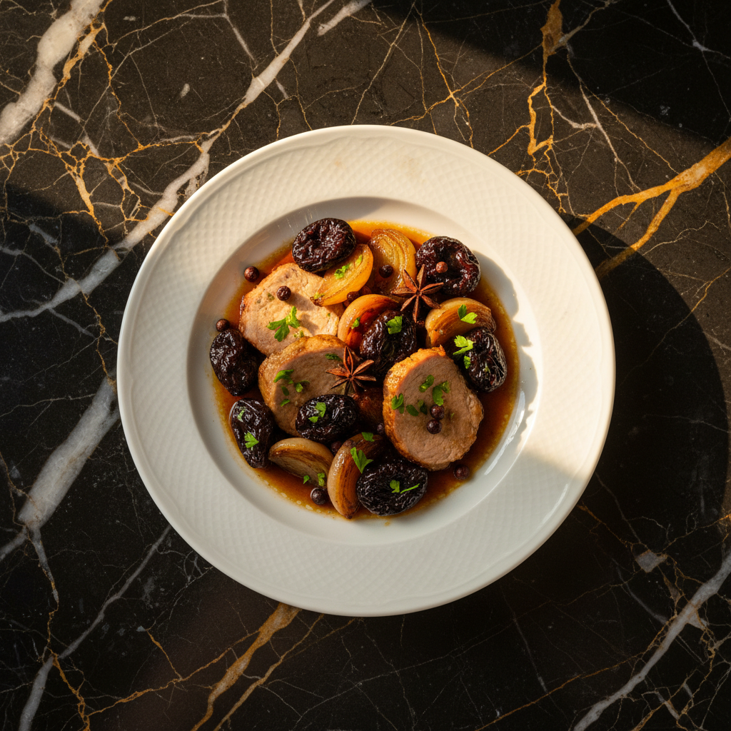 A succulent pork roast slow-cooked with dried prunes, onions, and aromatic spices, resulting in a tender, flavorful dish with a delightful sweet and savory balance. This dish is often prepared for special occasions and holidays.