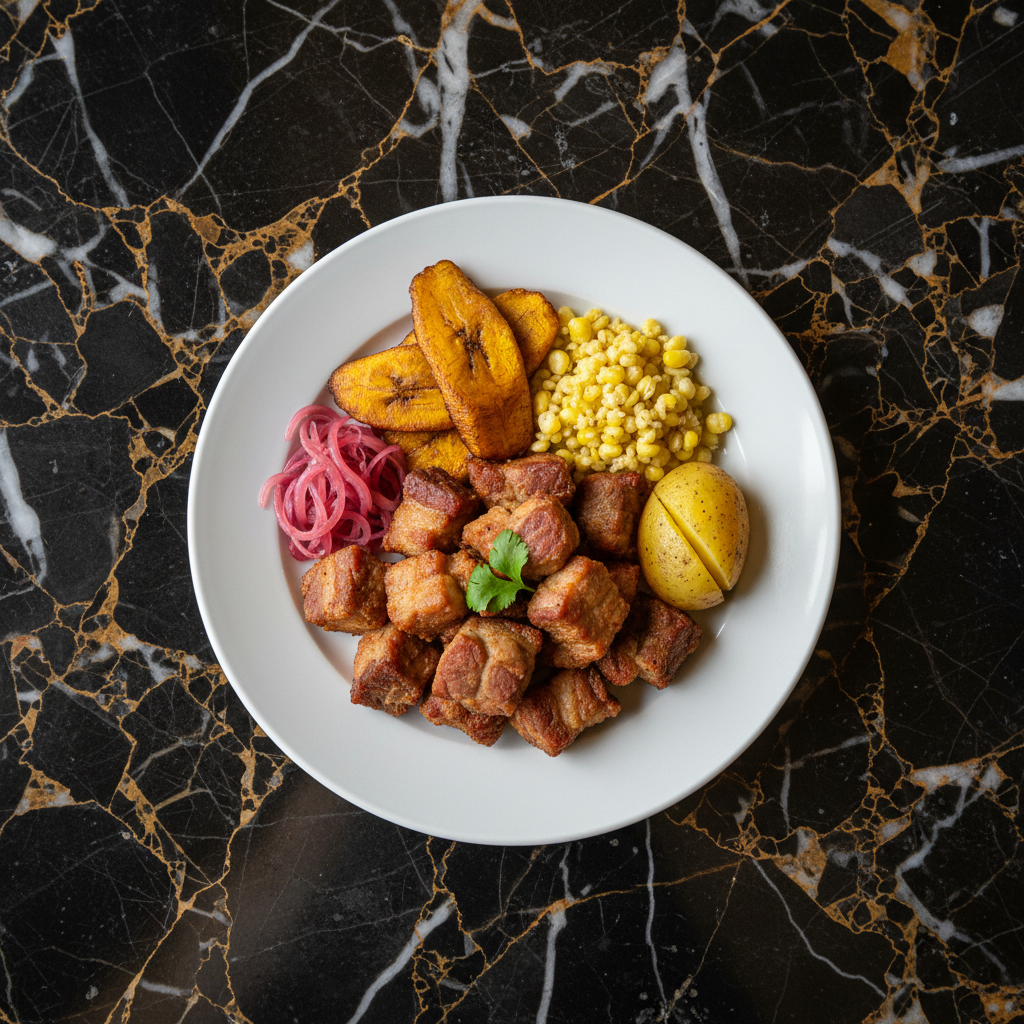 Fritada de Cerdo, also known as Fritada de Chancho, is a quintessential Ecuadorian dish of slow-cooked and then fried pork. It's characterized by its tender, succulent meat with crispy edges, traditionally prepared in a large copper pot (paila) and served with a variety of accompaniments.