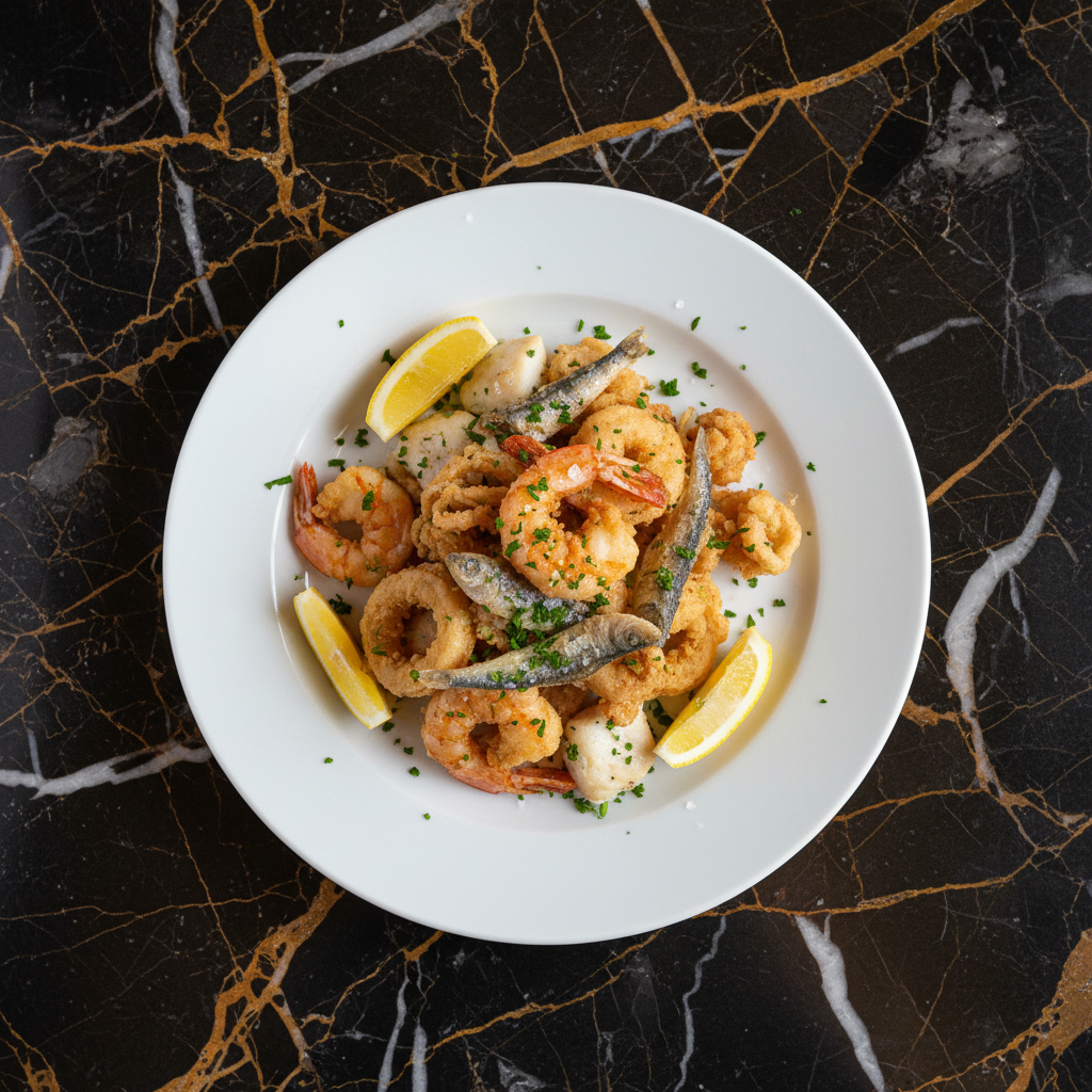 A classic Italian mixed fried seafood dish, featuring a light and crispy coating on shrimp, squid, and small fish, perfect as an appetizer or light main course. Served with fresh lemon wedges.