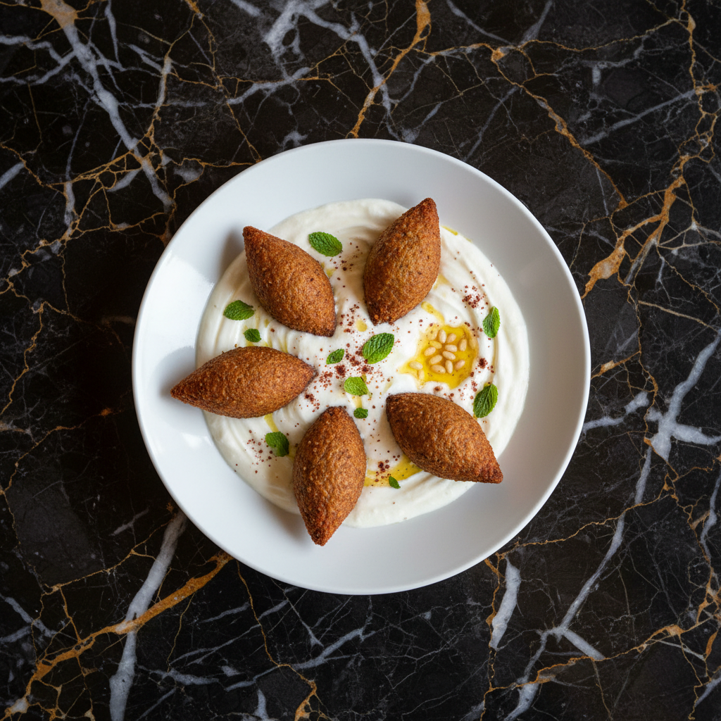 Crispy fried bulgur and meat shells filled with a savory spiced meat mixture, served in a tangy yogurt sauce. This is a variation on the more common Shish Barak, focusing on the fried kibbeh element.
