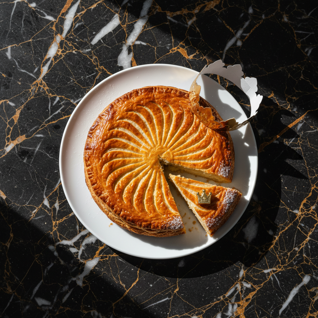 A traditional French king cake, made with flaky puff pastry filled with a rich frangipane (almond cream). The lucky person who finds the hidden 'fรจve' (a small charm) is crowned king or queen for the day. Perfect for Epiphany celebrations.