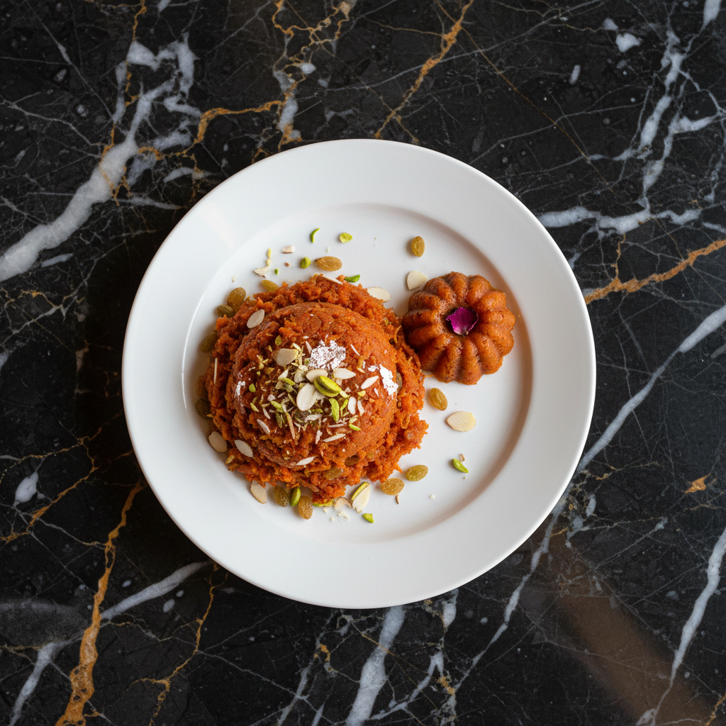 A rich and decadent Indian dessert made from grated carrots slow-cooked in milk and ghee with sugar, cardamom, and nuts. Traditionally enjoyed during winter celebrations, this 'carrot fudge' is a comforting and flavorful treat.