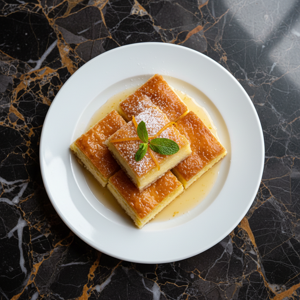 A classic Greek dessert featuring a rich, creamy semolina custard baked between layers of crisp, golden phyllo dough, all generously drenched in a fragrant citrus-infused syrup.