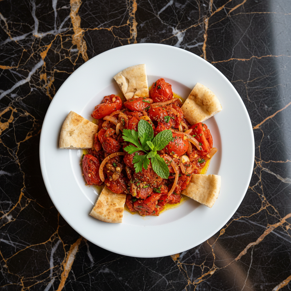 Galayet Bandora is a simple yet flavorful Palestinian dish of pan-fried tomatoes, often enhanced with garlic, onions, and a touch of spice. It's typically served hot with fresh pita bread, making it a popular breakfast or side dish.