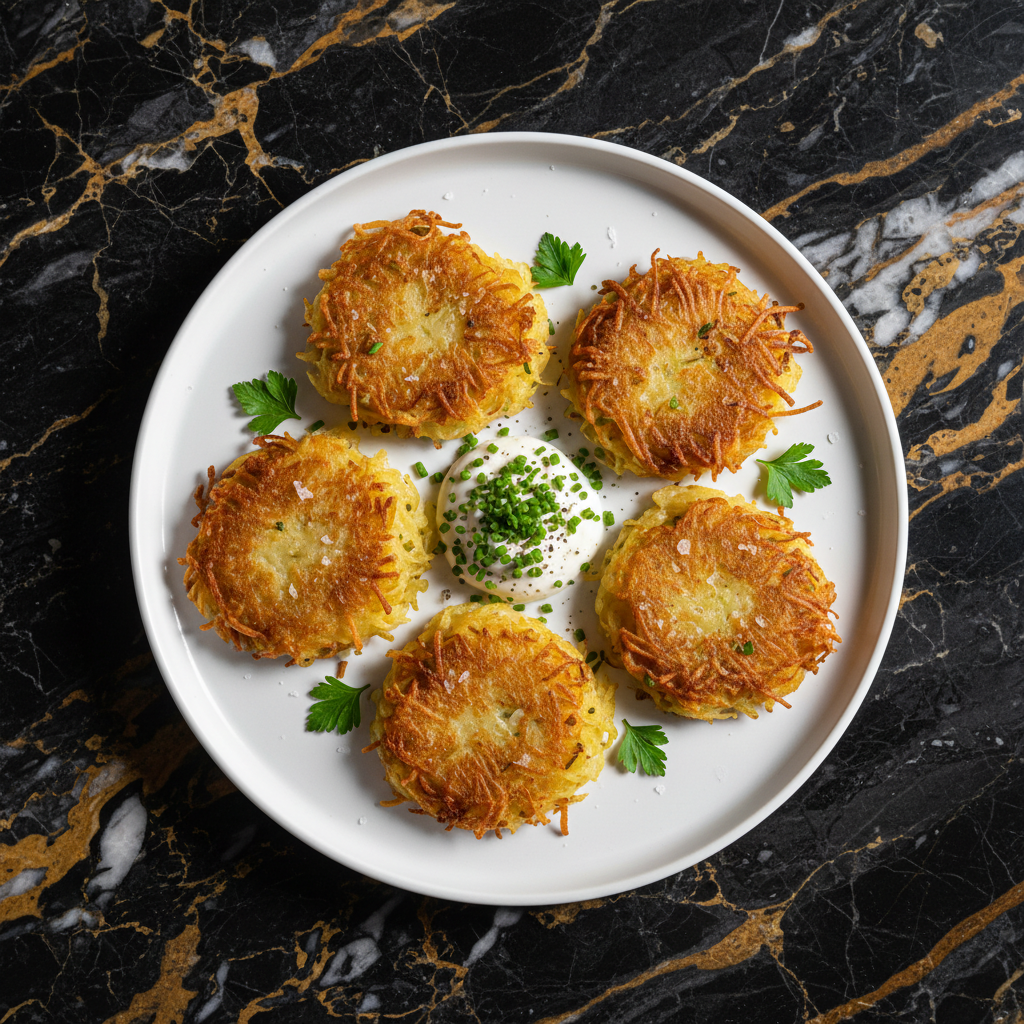 Crispy, pan-fried potato pancakes originating from the Liรจge region of Belgium. These galettes are made with grated raw potatoes, onions, and sometimes a touch of flour or egg, pan-fried until golden brown and delicious.