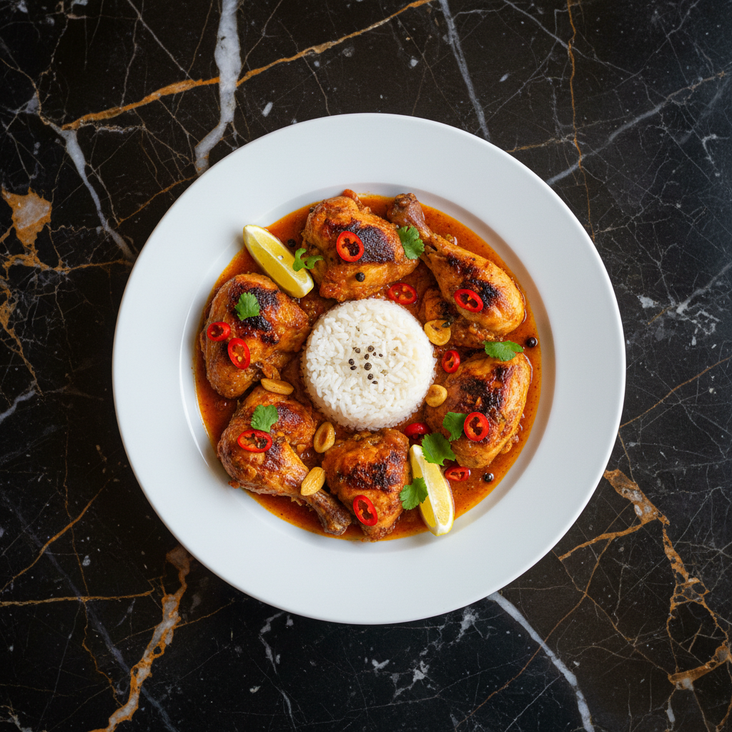 A spicy and flavorful chicken dish featuring chicken marinated in a piri-piri (malagueta pepper) sauce, then stewed and often finished by grilling or roasting. It's known for its vibrant heat and aromatic blend of garlic, onion, and lemon.