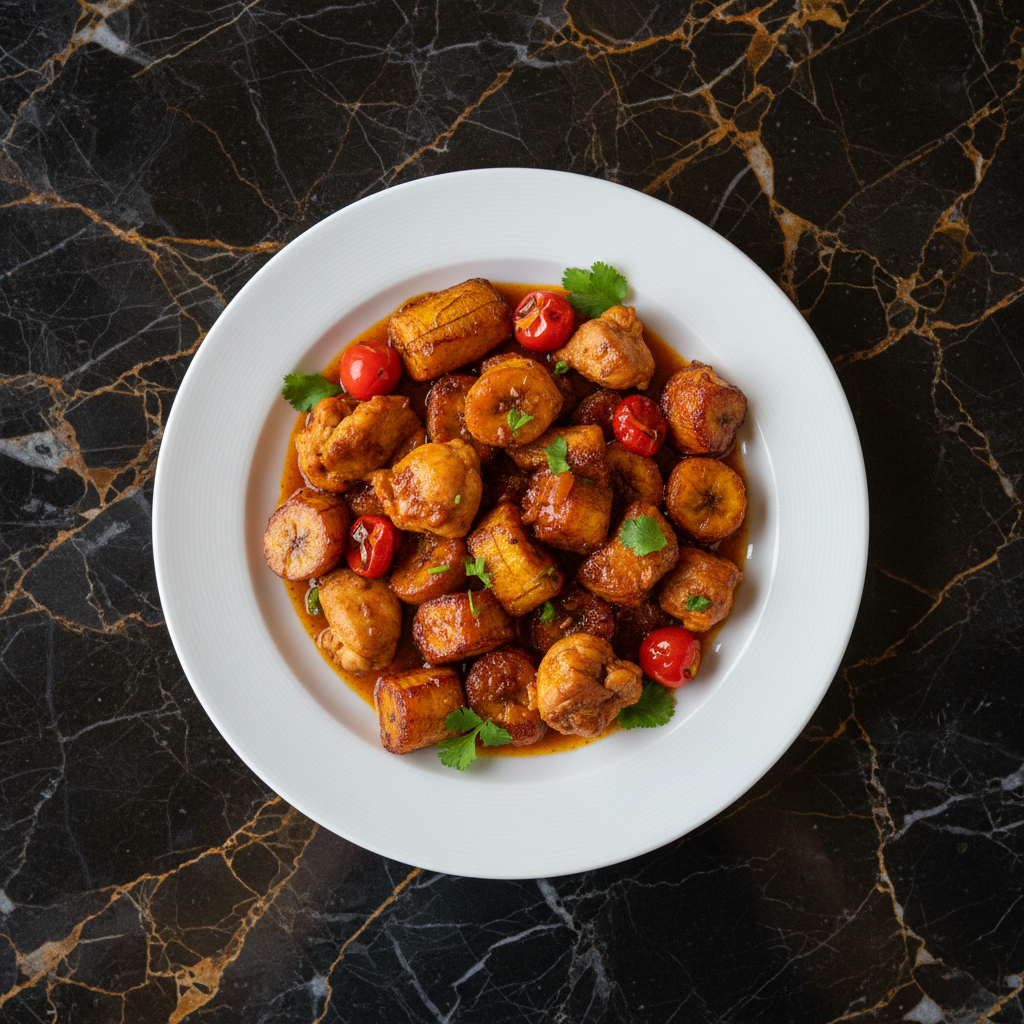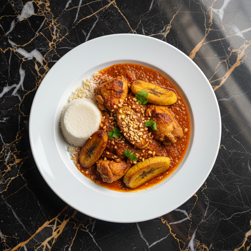 A flavorful and comforting chicken dish featuring tender chicken pieces simmered in a rich peanut and tomato sauce, complemented by the sweetness of ripe plantains. This dish showcases a harmonious blend of savory, sweet, and nutty flavors, often served with rice or xima.