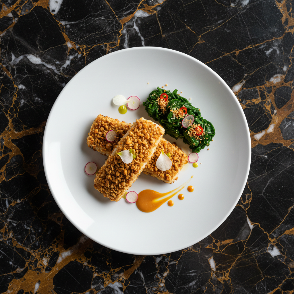 A modern take on Papua New Guinean cuisine, this dish features flaky barramundi fillets coated in a crunchy crust of roasted galip nuts, served with a side of steamed taro leaves.