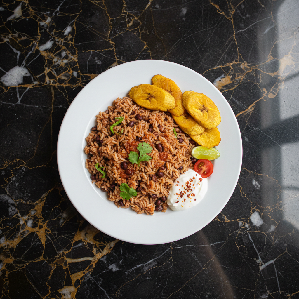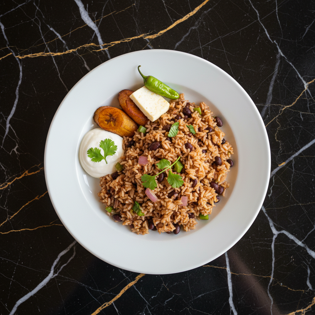 Central America's quintessential breakfast staple: perfectly seasoned rice and black beans fried together with aromatic vegetables and fresh cilantro. A simple yet deeply satisfying dish.