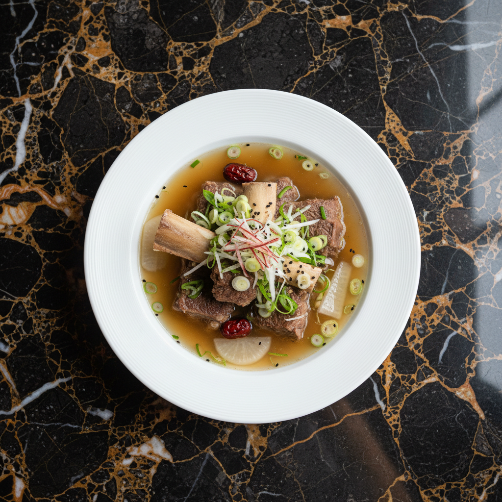 A comforting and deeply flavorful Korean soup featuring tender beef short ribs simmered in a clear, savory broth. This classic dish is known for its simplicity and the melt-in-your-mouth texture of the ribs.