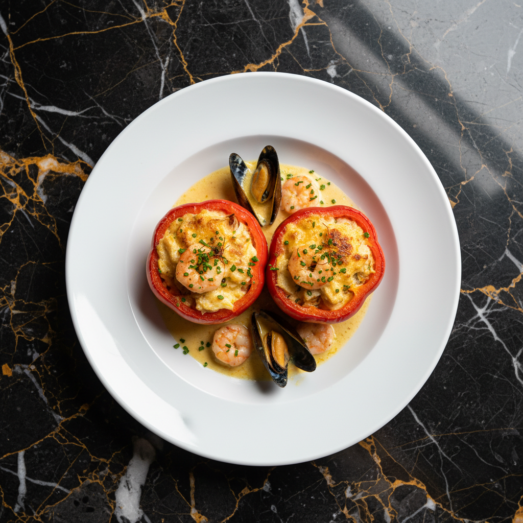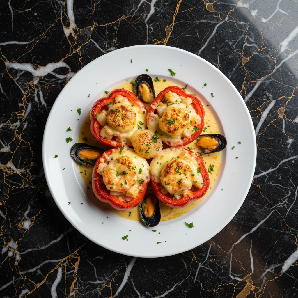 A delightful Galician specialty featuring sweet, roasted bell peppers generously filled with a rich and savory mixture of fresh seafood, often including shrimp, scallops, and mussels, bound together with a creamy bรฉchamel sauce and topped with melted cheese.