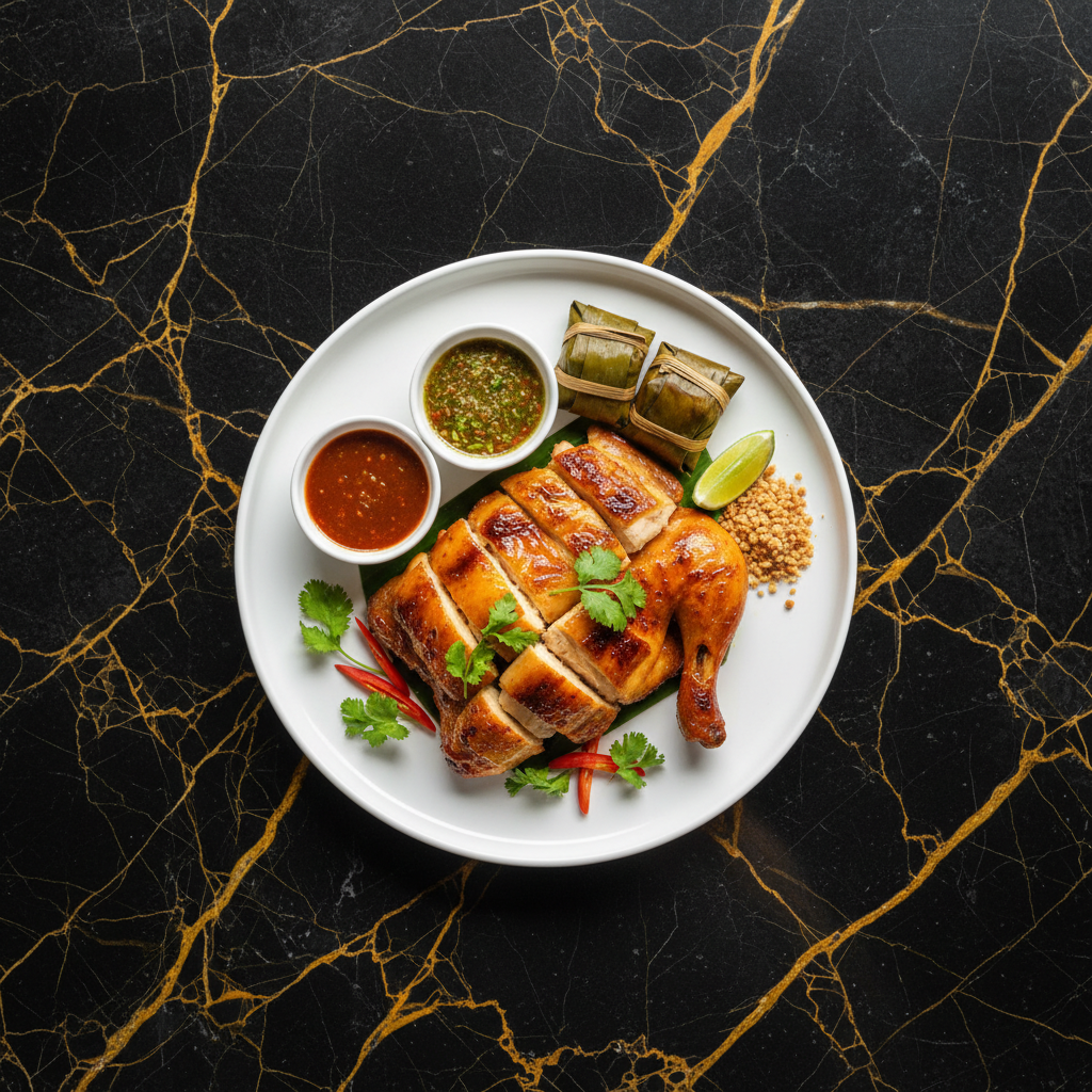 A quintessential Isaan-style Thai grilled chicken, marinated in a fragrant blend of herbs and spices, then grilled to smoky perfection. This dish is a beloved street food classic, best enjoyed with sticky rice and a spicy dipping sauce.