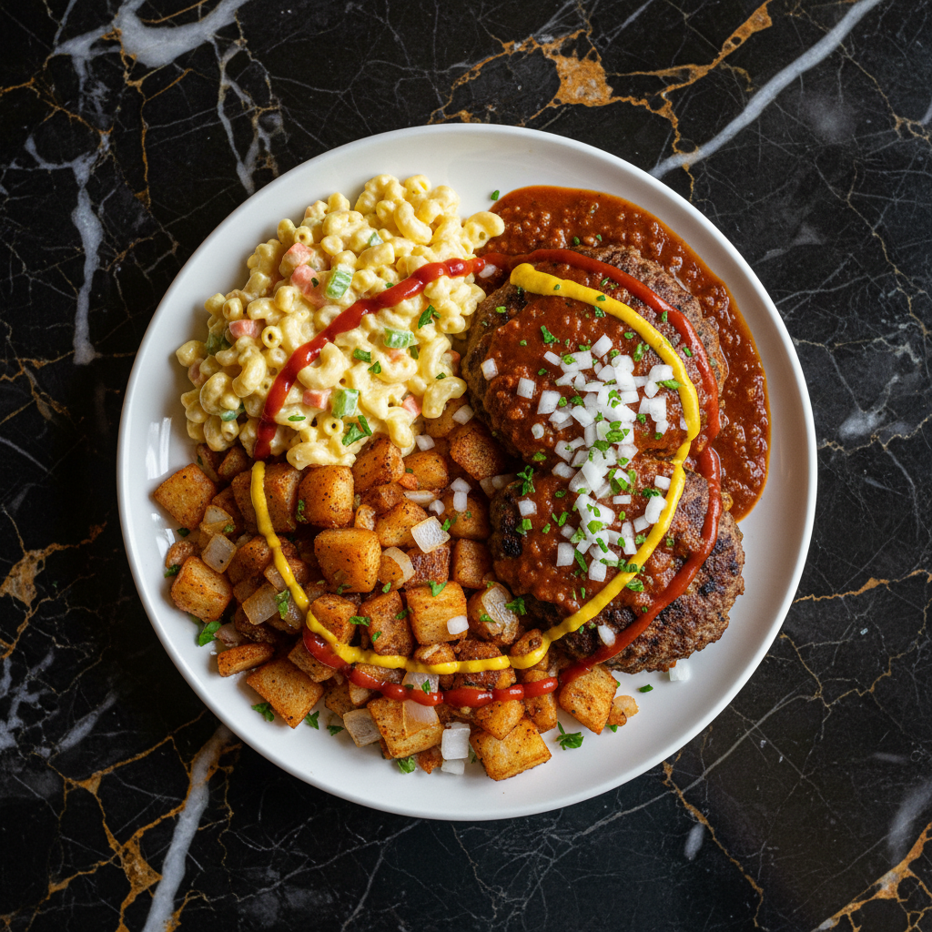 Rochester's legendary and unapologetically indulgent dish, featuring a hearty base of home fries and macaroni salad, topped with your choice of grilled meats, smothered in a rich meat hot sauce, and finished with diced onions and mustard. A true comfort food icon.