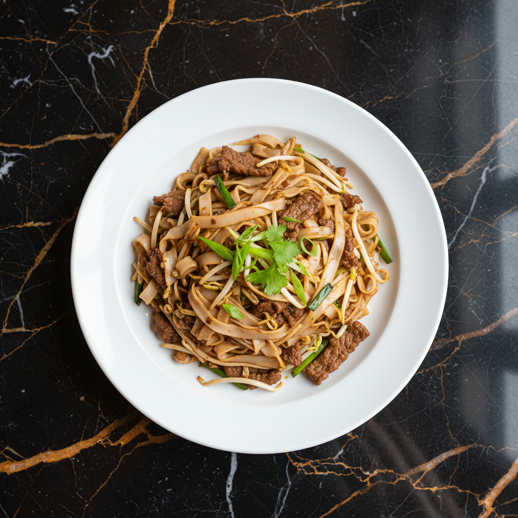 A classic Hong Kong cha chaan teng dish featuring silky, wide rice noodles stir-fried with tender beef, crisp bean sprouts, and fragrant scallions, infused with the coveted 'wok hei' (breath of the wok).