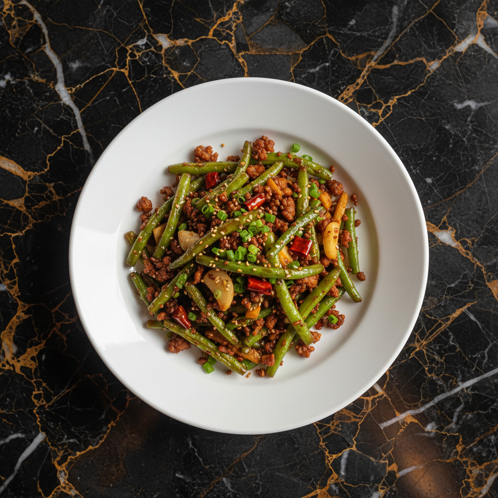 Authentic Sichuan dry-fried green beans, known as Gan Bian Si Ji Dou, featuring blistered green beans wok-tossed with savory ground pork, pungent preserved mustard greens (ya cai), and aromatic spices. This dish is characterized by its intense wok hei (breath of the wok) and complex flavor profile.