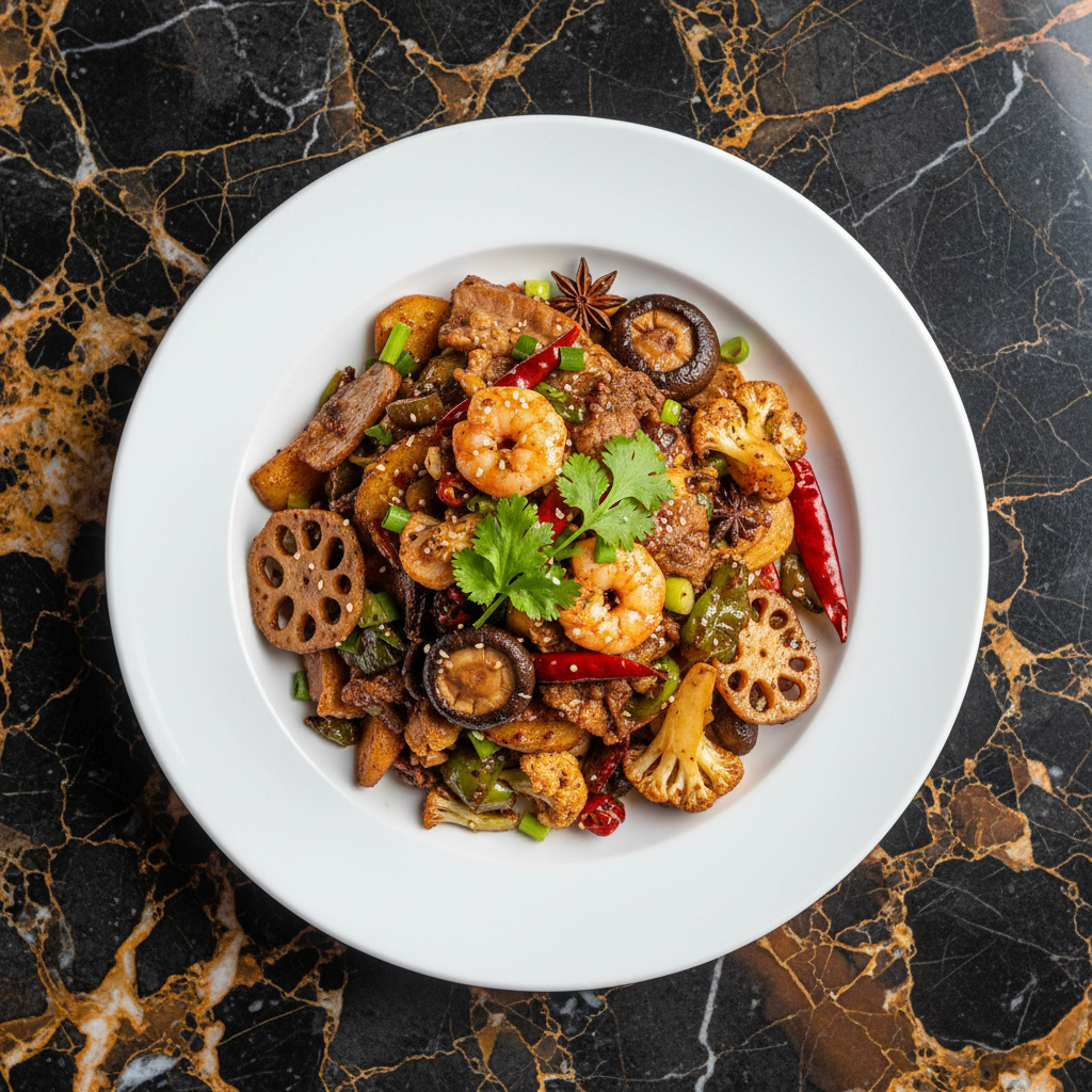 Hunan Gan Guo, or Dry Pot, is an intensely spiced and flavorful dish where various ingredients are stir-fried without broth, creating a concentrated taste. It's like a dry, more potent version of hot pot.
