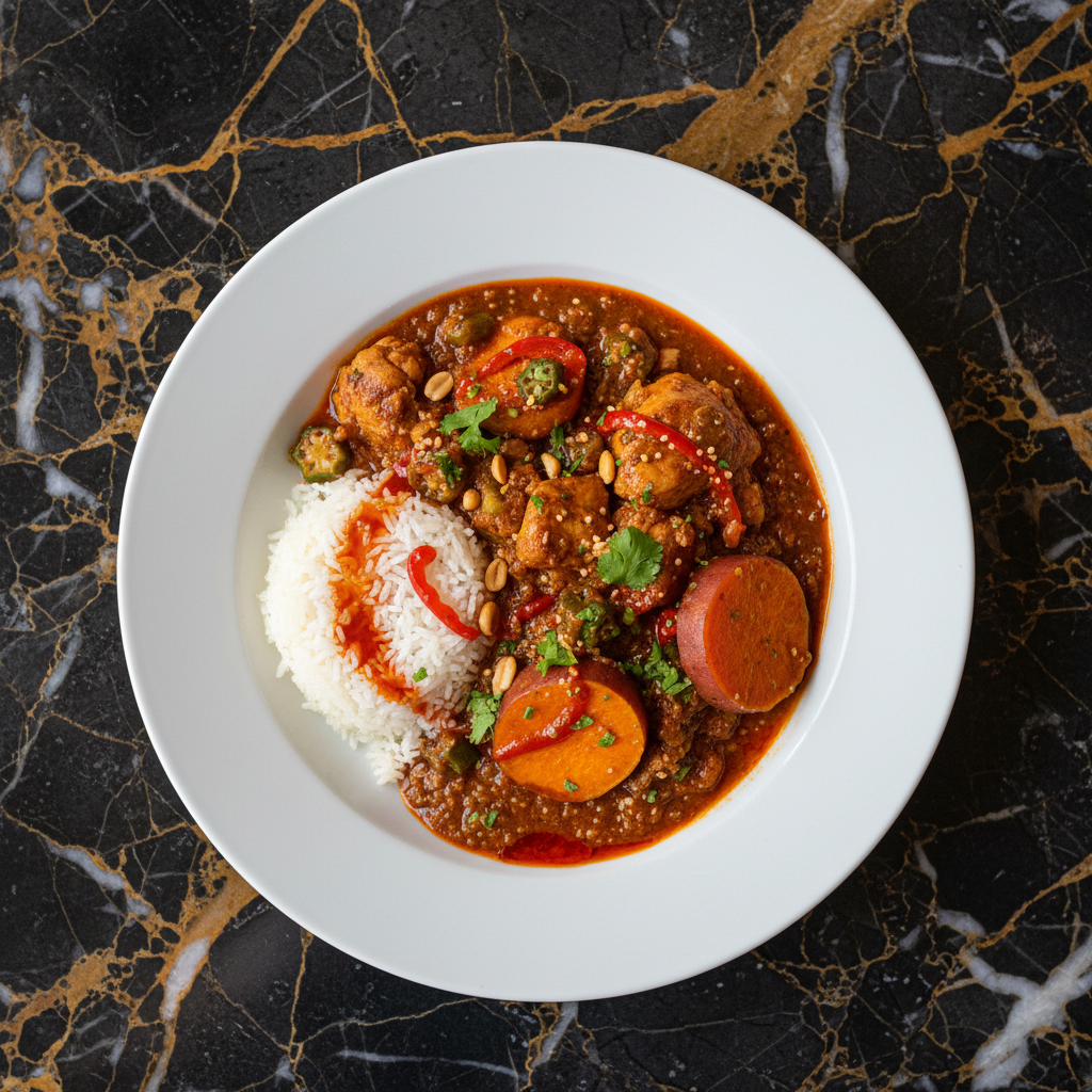 A rich and savory chicken stew featuring the nutty depth of sesame paste, balanced with aromatic vegetables and spices. This dish offers a comforting and flavorful taste of Gambian home cooking.