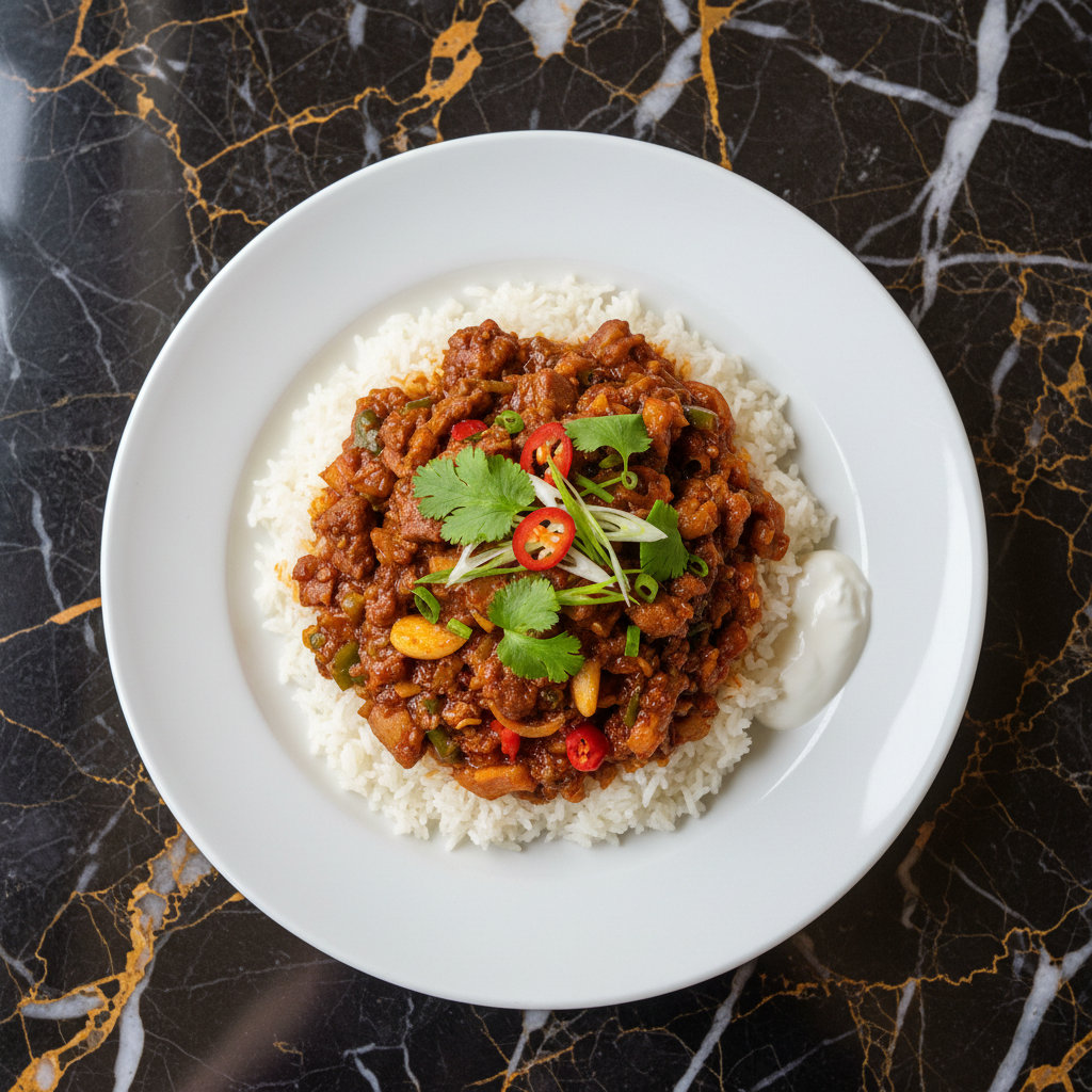 Ganfan is a flavorful and hearty dish originating from the Dungan culture, popular in Kyrgyzstan. It features a spicy meat and vegetable sauce served over steamed rice, offering a delicious alternative to noodle-based dishes like Laghman. It can be easily prepared as a vegetarian option upon request.
