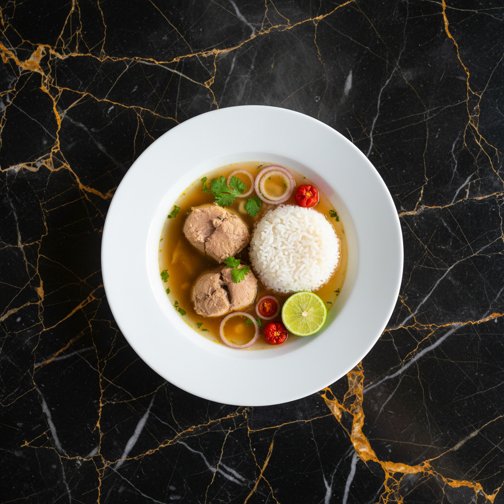 Garudhiya is a clear fish broth, a cornerstone of Maldivian cuisine. Made by simmering fresh tuna in water with minimal aromatics, it's a light yet deeply flavorful soup, often served with rice, lime, and chili.