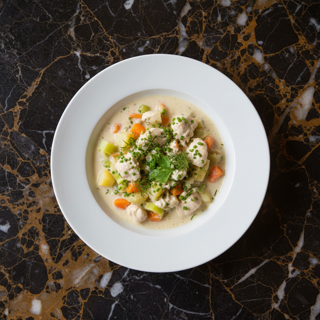 A rich and creamy chicken stew originating from Ghent, Belgium. This comforting dish features tender chicken and vegetables simmered in a velvety broth enriched with cream and fresh herbs.