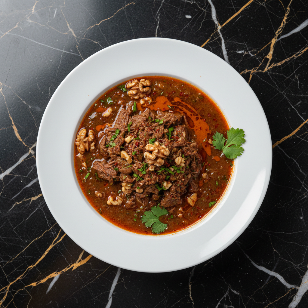 A rich and deeply flavorful Georgian beef soup, distinct from the more common tomato-based Kharcho. This version emphasizes tender beef, aromatic spices, and the nutty depth of ground walnuts, creating a hearty and satisfying meal.